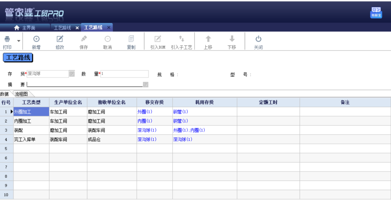 建立客戶化工藝流轉單:初步看到此工藝流程有些可能會覺得復雜繁瑣,其實在工貿PRO中建立起來很簡單,工貿Pro中的折疊工序概念很好地管理了這一點;例如把外圈加工需要的工種:粗車第一面粗車外內徑、粗車第二面粗車外徑、軟磨平面、軟膜外徑、細車外內徑車兩面內外倒角、粗車外溝道、細車外溝道、車溝邊角,統一命名為外圈加工;